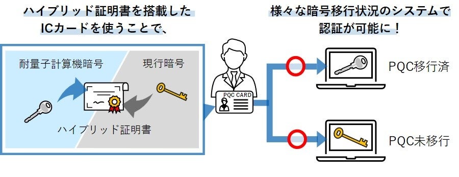 3者はPQCのICカードへの実装に関し2021年4月から連携して研究を進めており、今回、2022年10月に開発した「PQC CARDⓇ」(※1)およびプライベート認証局(※2)を、PQCと現行暗号による認証を両方可能とする電子証明書(以下 ハイブリッド証明書)に対応するようアップデートしました。