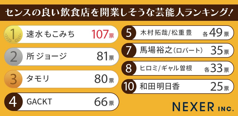 【男女1000人に聞いた】センスの良い飲食店を開業しそうな芸能人ランキング!