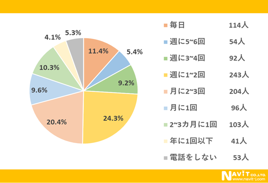 「どのくらい頻度で電話をしていますか?」という質問については、「週に1~2回」が24.3%、「月に2~3回」が20.4%、「毎日」が11.4%という順になりました。
