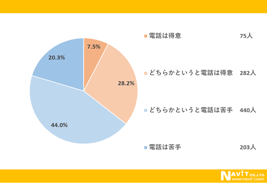 「電話をすることは苦手ですか?」という質問については、「どちらかというと電話は苦手」が44.0%、「電話は苦手」が20.3%と、合わせると64.3%の人が電話をすることが苦手だと回答していました。