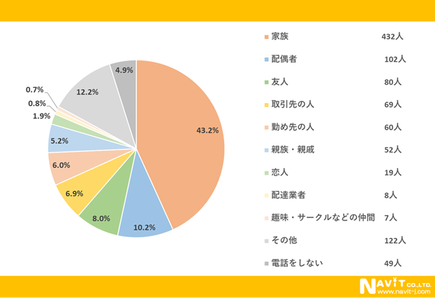 「最も電話をする相手は誰ですか?」という質問については、「家族」が43.2%、「配偶者」が10.2%、「友人」が8.0%という順になりました。家族と電話をしている人が多いようですね。