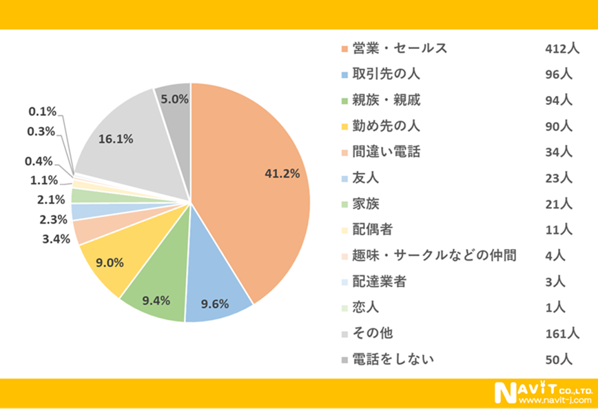 「電話をしていて最も苦手な相手は誰ですか?」という質問については、「営業・セールス」が41.2%、「取引先の人」が9.6%、「親族・親戚」が9.4%という順になりました。