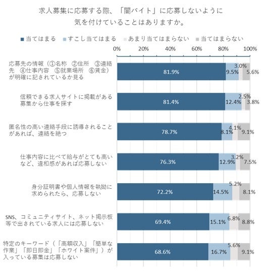 一方で「あまり当てはまらない」「当てはまらない」で多かったのは「SNS、コミュニティサイト、ネット掲示板等で出されている求人には応募しない」「特定のキーワードが入っている募集は応募しない」だった。アイデムが所属する全国求人情報協会をはじめ、各種関連団体では、求人の掲載にあたり必要なガイドラインを定めている。応募先の情報や仕事内容が不明確な求人には警戒するよう、求職者に引き続き啓発していく必要がありそうだ。