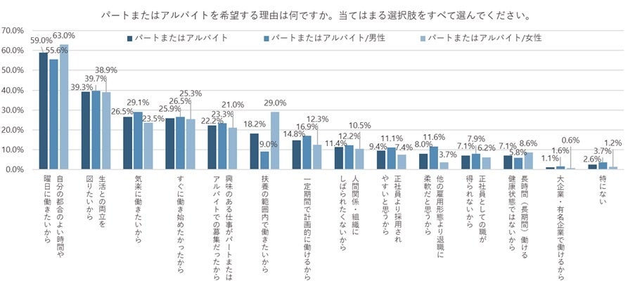 求人に応募した、パートまたはアルバイトを希望する人に、なぜその雇用形態を希望するのかをきいた(複数回答)。最も多かったのは「自分の都合のよい時間や曜日に働きたいから」で59.0%、次いで「生活との両立を図りたいから」が39.3%、「気楽に働きたいから」が26.5%となった。