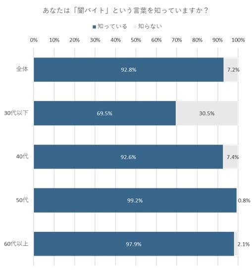 求人に応募した人に、「闇バイト」という言葉を知っているかどうかきいた。全体では92.8%が「知っている」と回答し、多くの人に認知されていることがわかる。