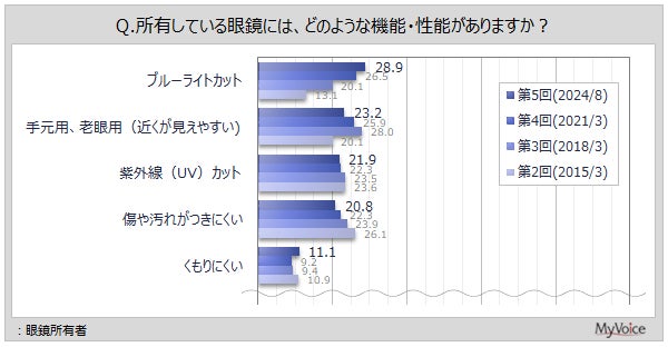 【眼鏡に関する調査】所有している眼鏡にある機能・性能は、「ブルーライトカット」が眼鏡所有者の3割弱で増加傾向。「手元用、老眼用」「紫外線カット」「傷や汚れがつきにくい」が各2割強