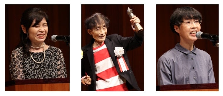 贈呈式には、『ゆりあ先生の赤い糸』でマンガ大賞に輝いた入江喜和さん(57)=写真左=、新生賞『断腸亭にちじょう』のガンプさん(43)、短編賞『女の子がいる場所は』のやまじえびねさん(58)=写真右=、特別賞の楳図かずおさん(86)=写真中央=が登壇。正賞の鉄腕アトム像を受け取った後、感動あり、笑いあり、ユーモアありのスピーチを披露しました。