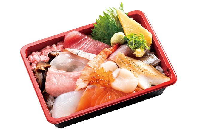 本まぐろ中とろ・真鯛・バチまぐろ・いか・生サーモン・ほたて・上あなご・あじ・茹でえび・いくら・切玉子入り