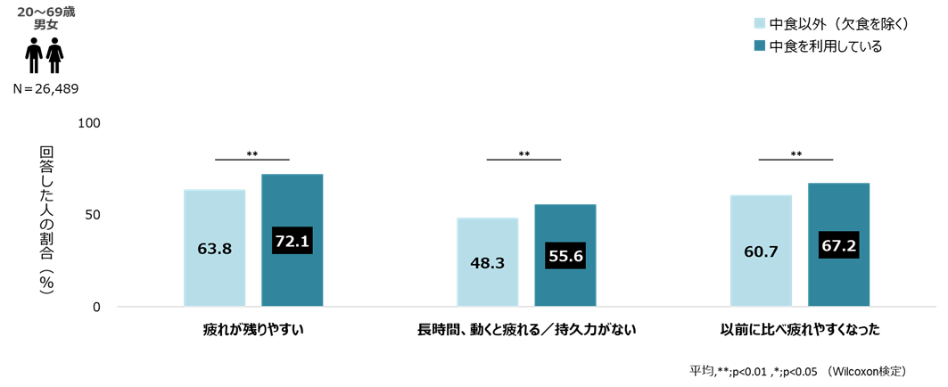 中食以外の人と比べ、「疲れが残りやすい」「長時間、動くと疲れる/持久力がない」「以前に比べ疲れやすくなった」と回答した割合が高かった。