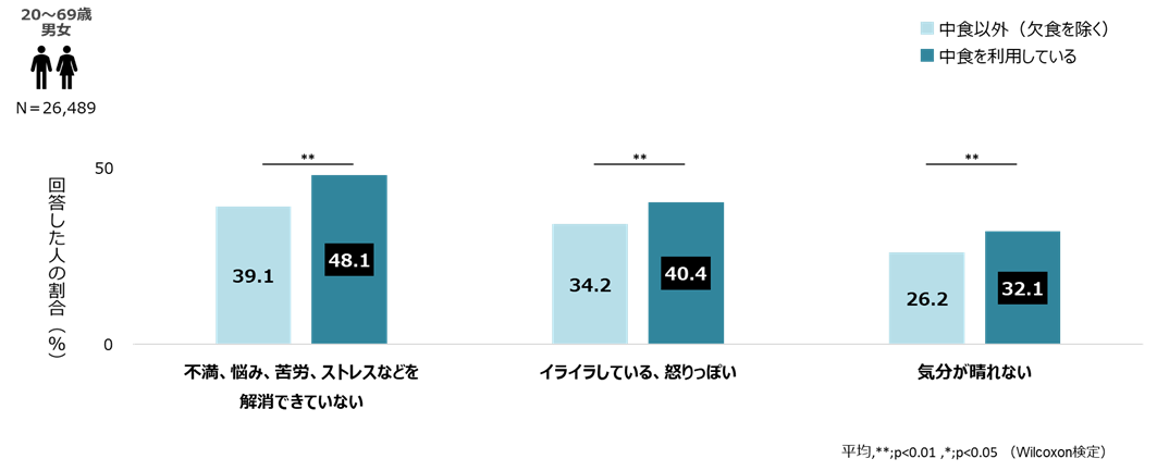 中食以外の人と比べ、「ストレスを解消できていない」「イライラしている」「気分が晴れない」と回答した割合が高かった。
