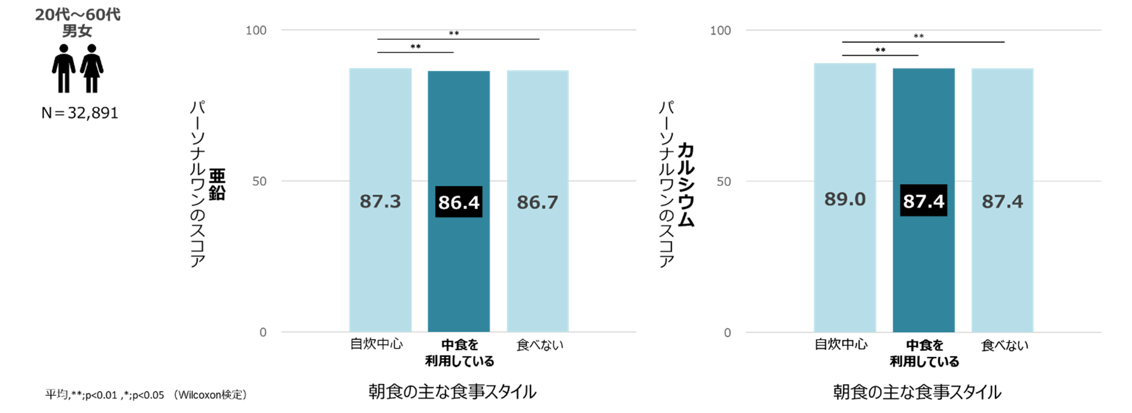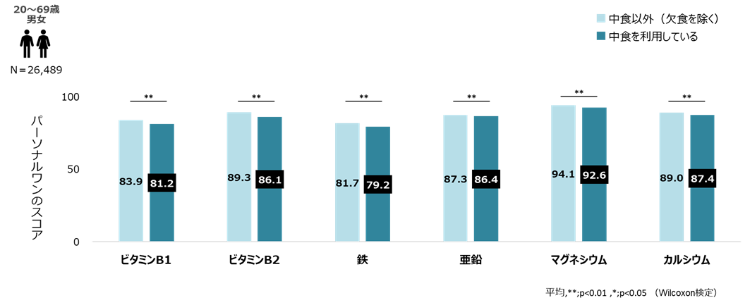 ※オーダーメイドサプリメント「パーソナルワン」初回購入時20歳から69歳の男女(33,246人)のうち、朝食を摂取している26,489人を対象に解析。朝食を「中食(市販のお弁当やインスタント食品、お総菜などの調理済み食品〔パンを含む〕)」と回答した人と、中食以外と回答した人(欠食者を除く)を比較した。