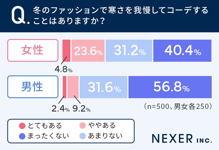 女性の71.6%、男性の88.4%が、冬のファッションで寒さを我慢してコーデすることは「ない」と回答しています。