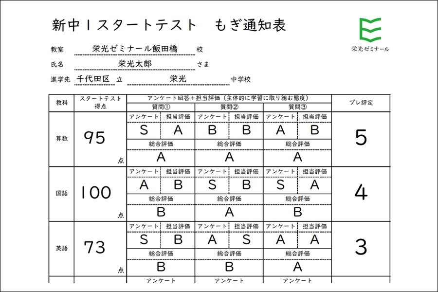 さらに、受験者アンケートに基づいた学校での授業態度や提出物状況とテスト結果を元にした「もぎ通知表」を進呈します。高校受験で重要な内申点を上げるためには、定期テストの得点以外の部分も重要です。「もぎ通知表」を通して、授業の受け方や提出物の出し方を中学校入学前に点検します。