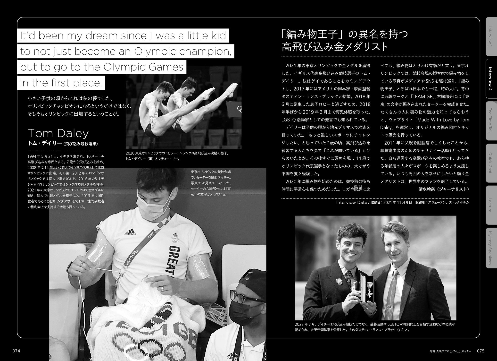 トム・デイリーは、イギリス出身の高飛び込み選手です。その才能と親しみやすい人柄から、人気アスリートとしてイギリスの水泳界をけん引してきました。2013年には同性愛者であることをカミングアウトし、LGBTQコミュニティーの権利向上を目指す活動をしていることでも知られています。インタビューでは、東京オリンピックで念願の金メダルを獲得したときのこと、飛び込み競技の怖さと面白さ、カミングアウトしたこと、そして趣味の編み物について話しています。