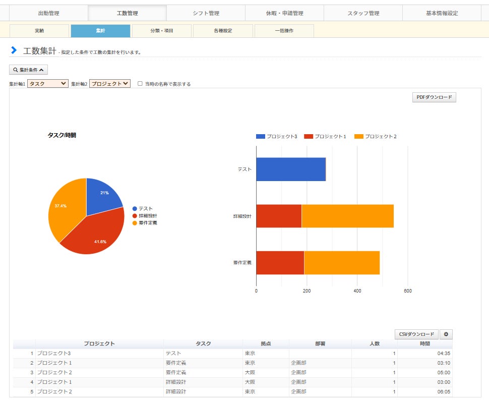 たとえばプロジェクトごとに各業務の工数内訳を集計・分析することで、最適な人材配置を行うことも可能です。