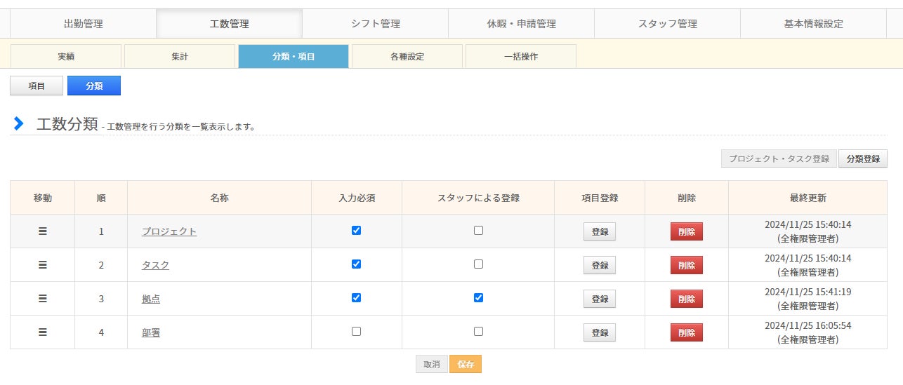 工数に関する分類項目の追加や、実績の閲覧権限などを細かく設定することができ、入力者・管理者の役割を適切に割り振ることができます。