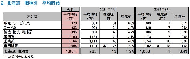 [北海道版]2022年4月度 アルバイト・パート募集時平均時給調査 北海道の4月度平均時給は前年同月より19円増加の1,004円