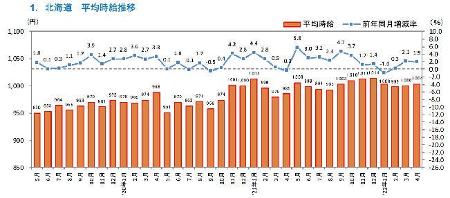 ■北海道の平均時給は1,004円(前年同月985円、前月1,000円)