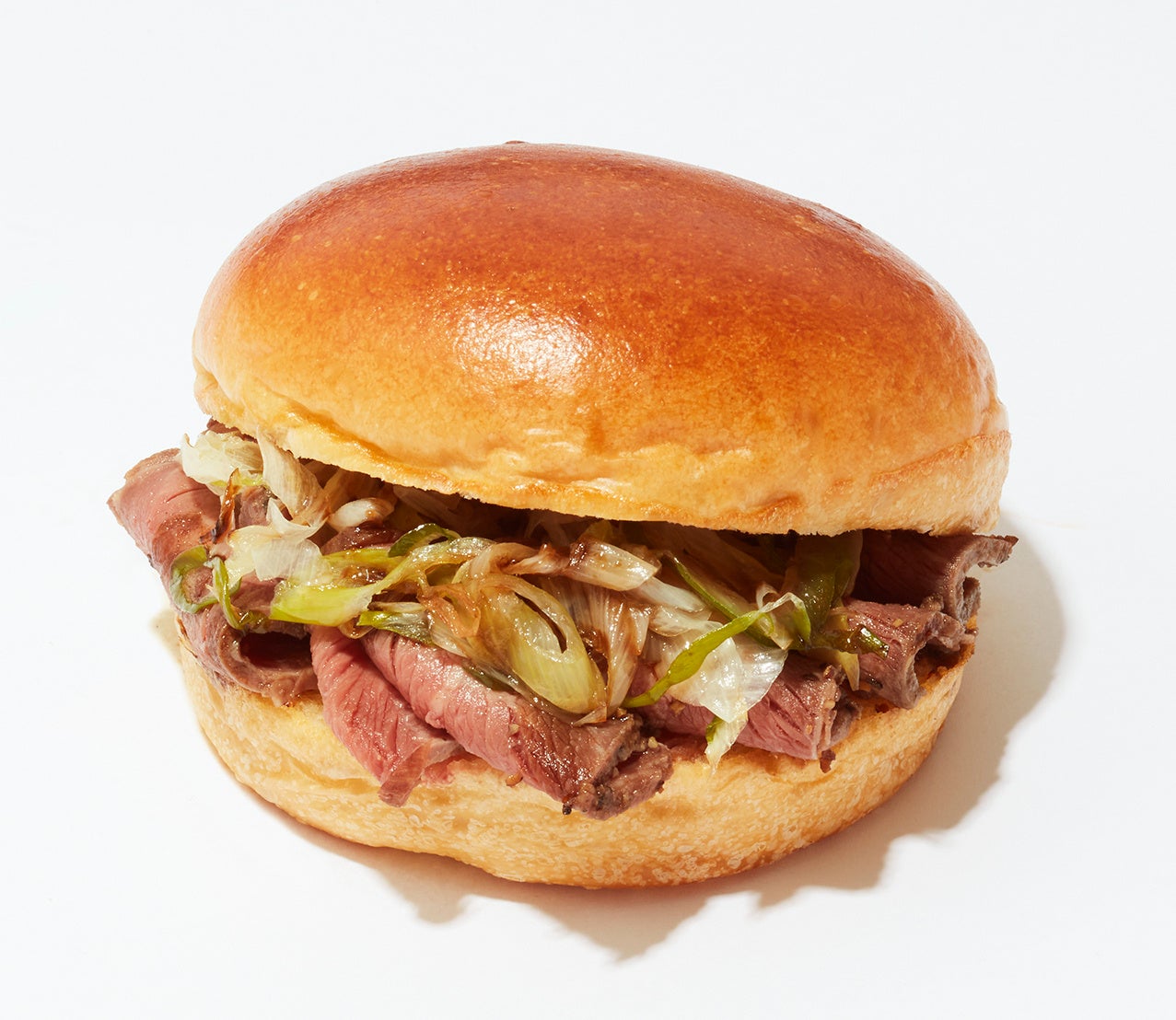 ローストビーフとローストネギをサンドし、仕上げにバルサミコソースを絡めたハンバーガー。