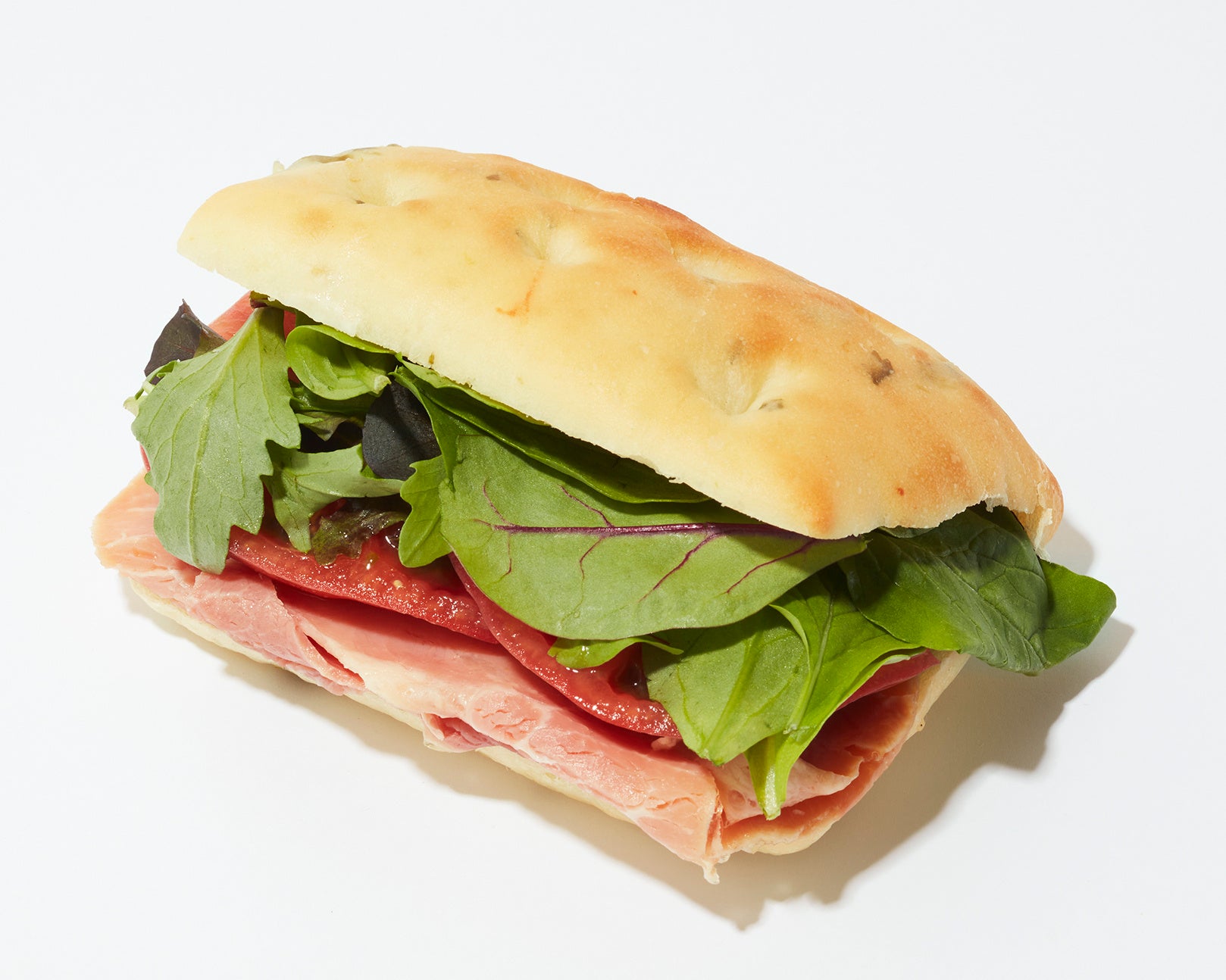 ハム・トマト・ベビーリーフをフォカッチャでサンド。ピリッとしたハラペーニョがアクセントに。