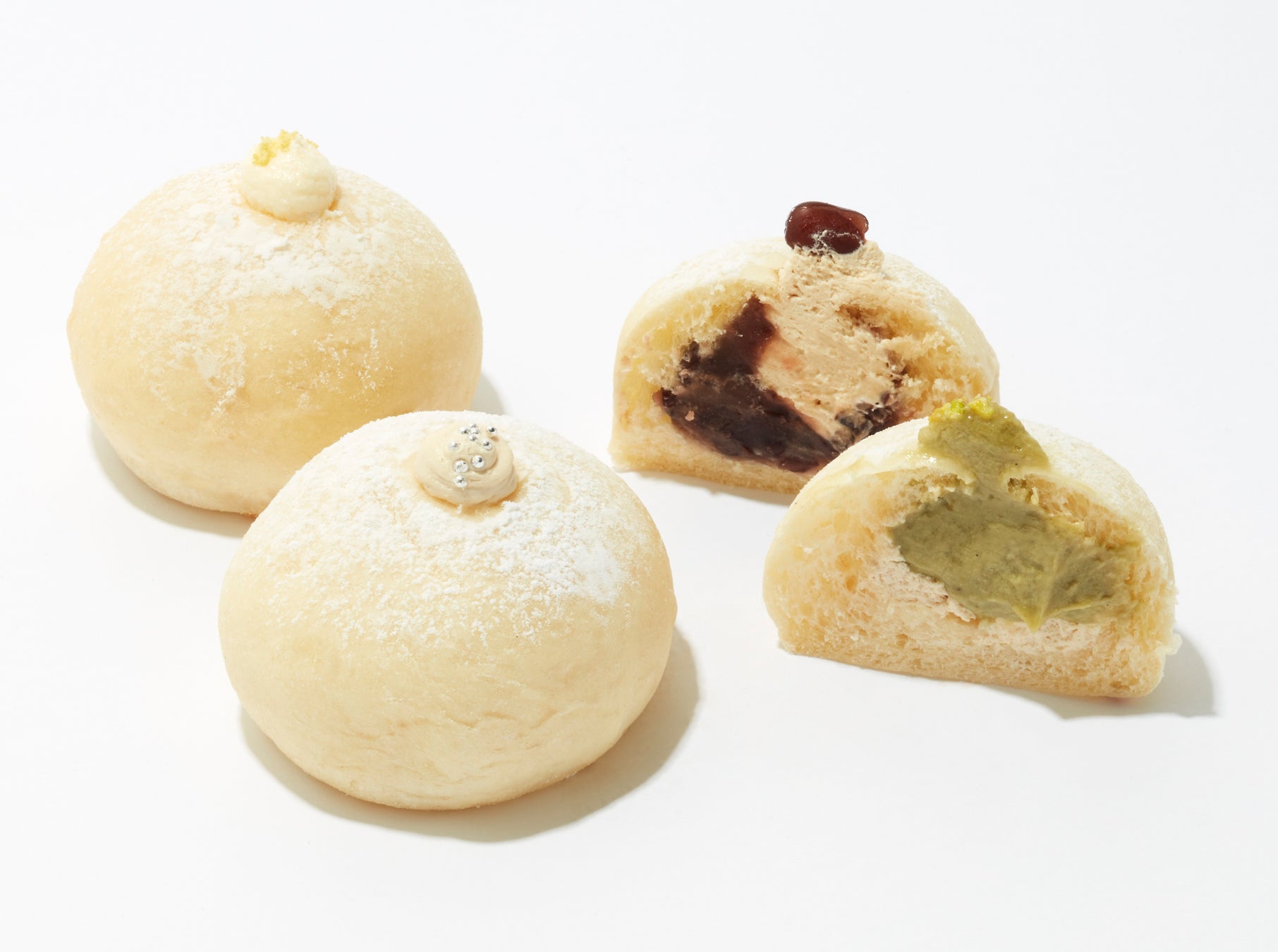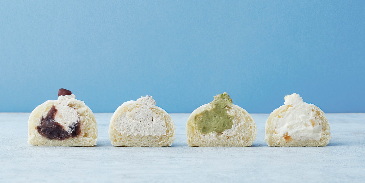 もっちりとした食感が特徴のアンジュ生地で、ホイップクリームと各フレーバーを包んだ見た目もかわいい夏の新作クリームパンです。フレーバーは、カスタード・小倉あん・ピスタチオ・レモンの4種類をご用意。