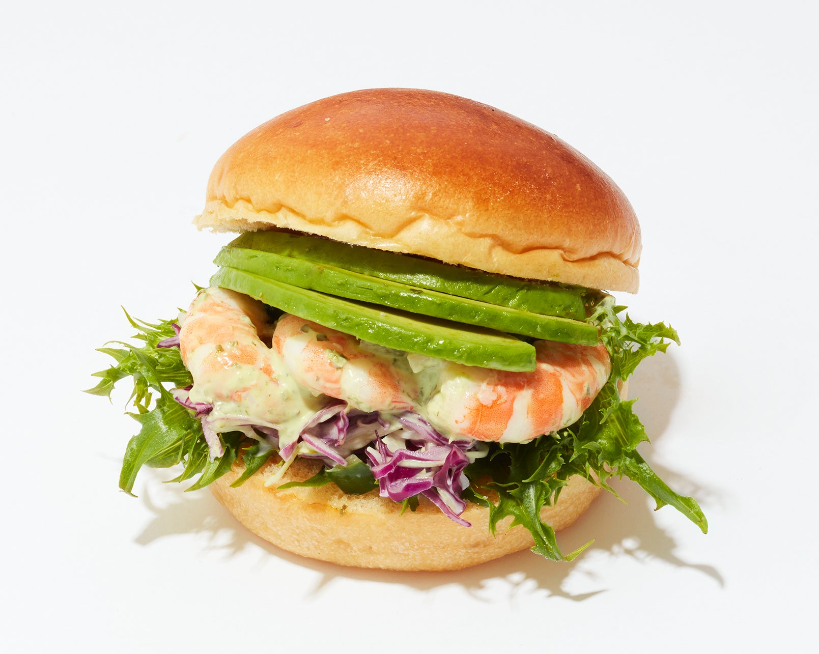 バジルマヨで仕上げた海老とアボカドをたっぷりサンドしたハンバーガー。