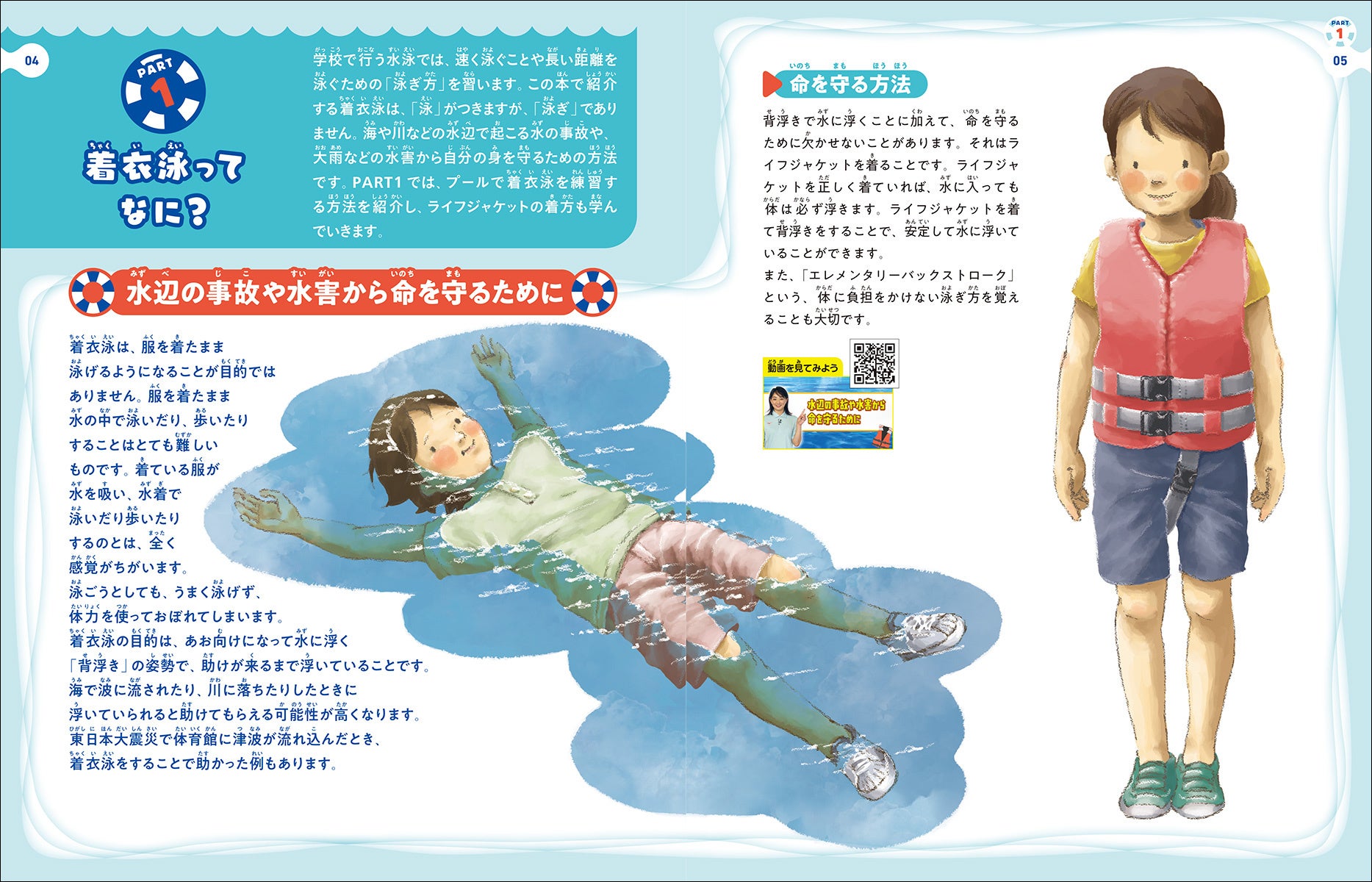 この本では、海や川、プールなど水辺で遊ぶ前に注意すべきことから、着衣泳の練習の仕方、浮き具になるもの、水に落ちた人を見かけたときの対処法を紹介しています。