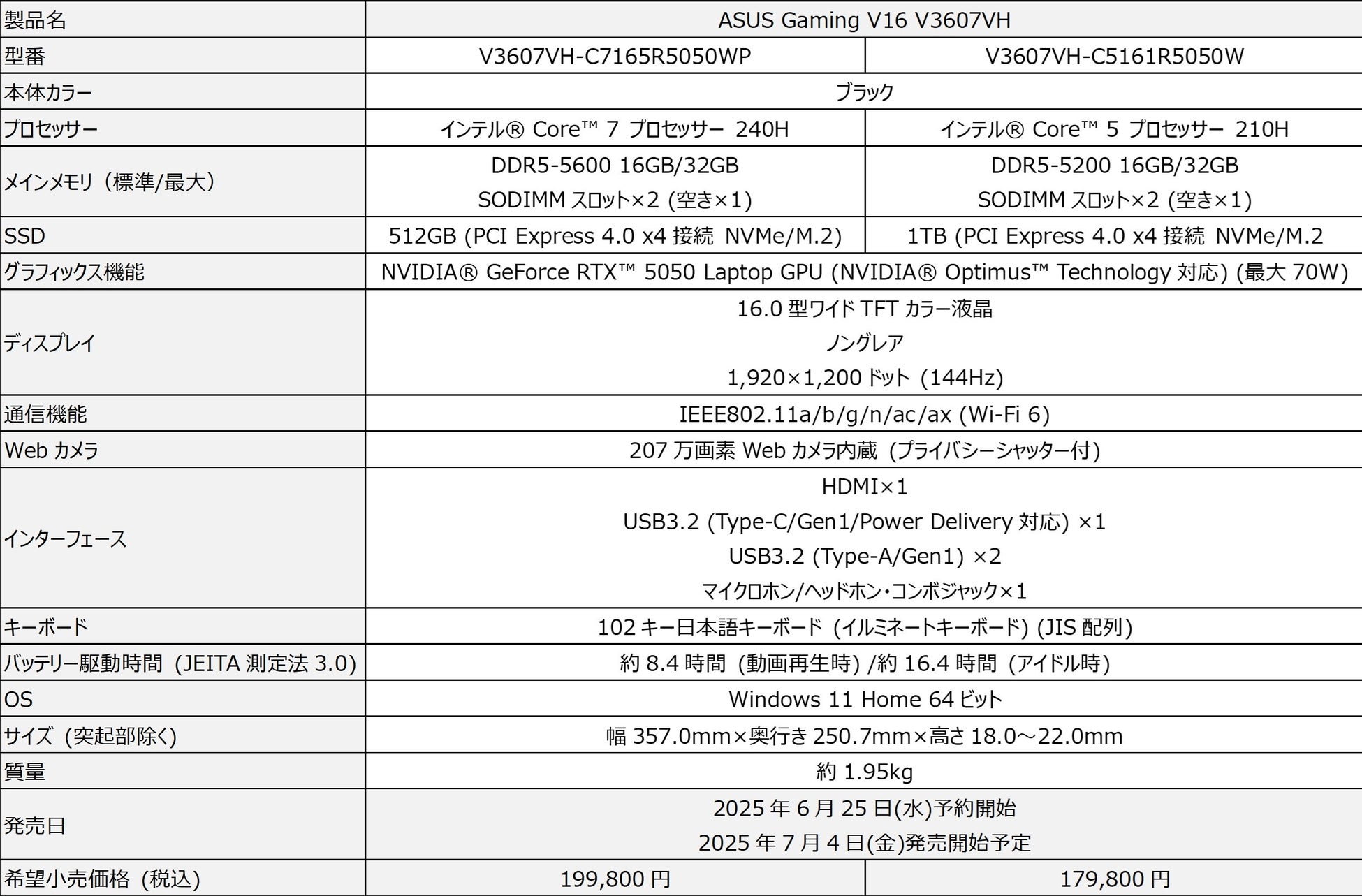 ASUS JAPAN株式会社は、初めてのゲーミングノートPCに最適な「ASUS Gaming V16 V3607」シリーズに、最新のインテル® Core™ 7 プロセッサー 240H、または、インテル® Core™ 5プロセッサー 210Hと、NVIDIA® GeForce RTX™ 5050 Laptop GPUを搭載した「ASUS Gaming V16 V3607VH」を発表いたしました。本日6月25日(水)より予約開始し、7月4日(金)発売開始予定となります。