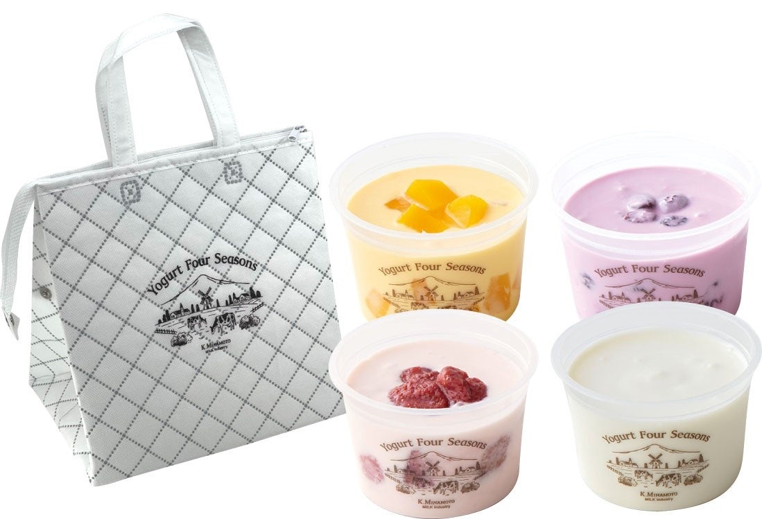 内容:自家製カップヨーグルト詰め合わせ(プレーン加糖・イチゴ・マンゴー・ブルーベリー/各1点)、オリジナル保冷バッグ付き