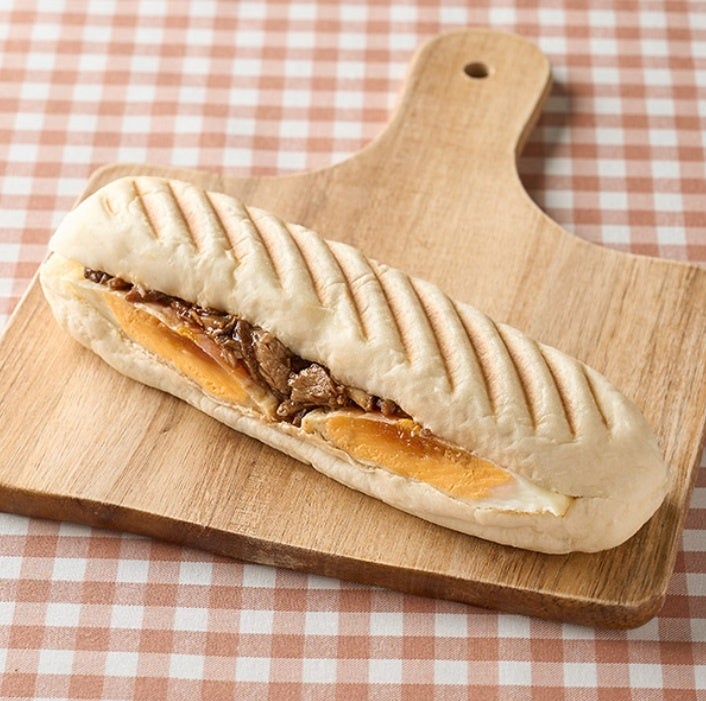 【内容】愛媛県のご当地グルメ「焼豚たまご飯」をイメージしたパニーニ。醤油ベースの甘めのタレと焼豚の組み合わせ。目玉焼きは濃厚な黄身の味が特徴の香川県産の卵「オリーブエッグ」を使用しました。
