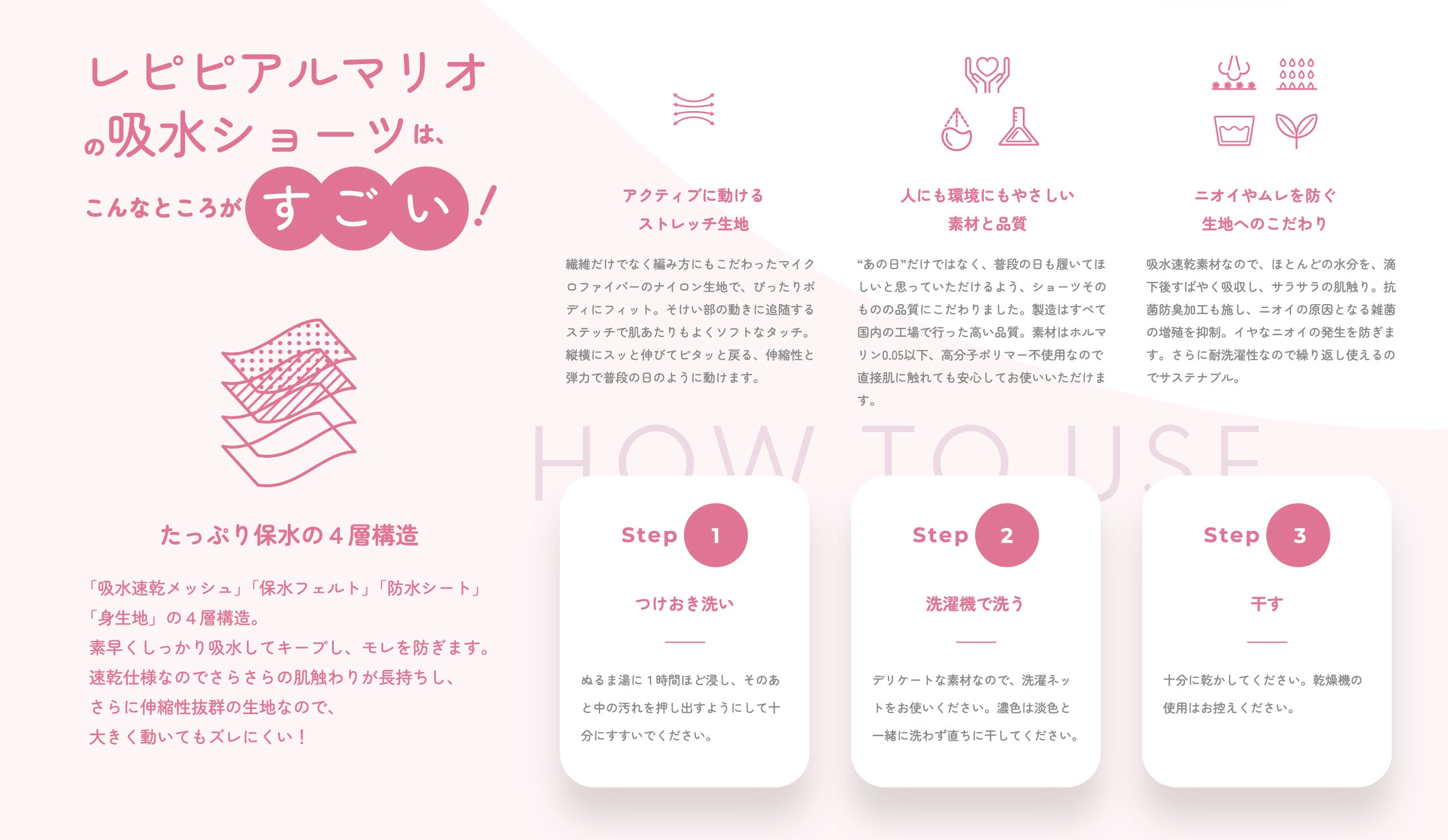 レピピアルマリオは、ちょっと背伸びをしたい女の子のためのティーンズブランドです。子どもを持つ女性スタッフも多いことから、10年以上ティーン世代の女の子とその家族に向き合ってきた中で、生理の悩みが身近であり、レピピアルマリオでも何かできることはないかと考えてきました。また、アダストリアが社員・店舗スタッフに行った独自のアンケートでは、「お子さまは、生理についてどのような悩みを持っていますか?」という質問に対し56%が「動いたりする際のズレや、経血量が多いときにモレで下着や洋服にしみてしまうこと」と回答し、「異性(男の子)に生理中であることを気づかれたくない」女の子が42%と、ナプキン使用時の不安や、周囲に知られたくない恥ずかしさを感じていることがわかりました。このような背景から、機能性とデザイン性に定評のある株式会社ヤギが開発した4層構造で吸水力の高い吸水ショーツを、ティーンが使用しやすい形や色、手に取りやすいポップなパッケージでレピピアルマリオのオリジナル製品として発売するに至りました。肌に優しいこだわりの生地を使用し、完全国内生産で安心してご使用いただけます。また、「子どもが使用する下着は親が選ぶ」と答えた人が80%と、非常に多い点にも注目し、親子で安心と納得感を持ってご購入いただけるよう、親世代向け商品も併せて発売いたします。