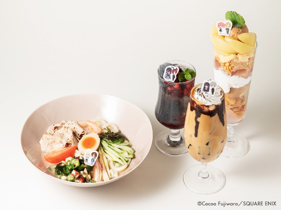 「妖狐×僕SS」の凜々蝶や双熾達をイメージしたお食事やスイーツ、特典コースターをご用意いたしました。ドリンクメニューはテイクアウトもご利用いただけますので、お気軽にご利用ください。