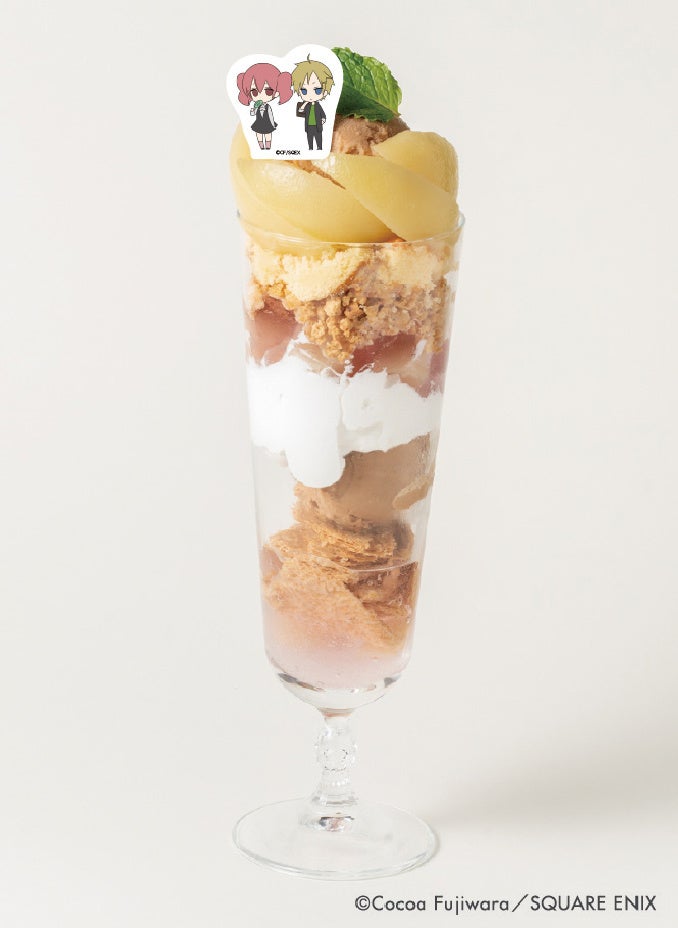 カルタと渡狸の二人をイメージした、茶色のアールグレイアイスとピンク色の甘い白桃のパフェ。