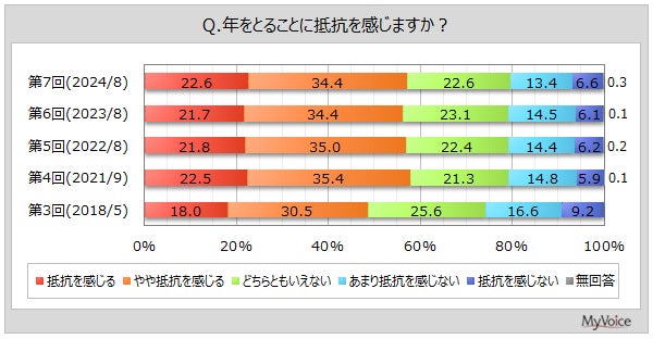 年をとることに抵抗を感じる人は、「抵抗を感じる」「やや抵抗を感じる」を合わせて6割弱です。