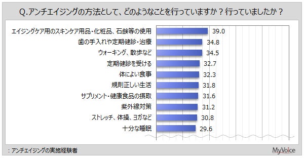 「エイジングケア用のスキンケア用品・化粧品、石鹸等の使用」が39.0%、「歯の手入れや定期健診・治療」「ウォーキング、散歩」などが各30%台です。