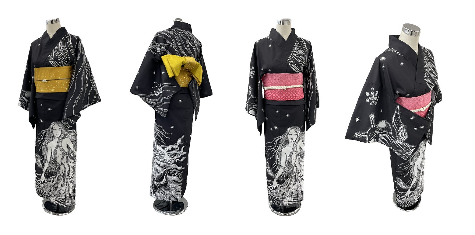 「JUNJI ITO PROJECT」発足を記念したオリジナル商品の1つ目は、慶応二年(1866年)創業の太田旗店が制作を手がけた絵羽浴衣(えばゆかた)です。伊藤氏が本プロジェクトのために描き下ろした新作『深海の美女』。ミステリアスで優雅なこの作品を、大胆にも浴衣にアレンジしました。どの角度からも作品の表情を楽しめるこの浴衣は、モノトーンなので帯などの装飾品によりバリエーションも楽しむことができます。これからの季節、お祭りや花火大会への装いとして、伊藤氏の描く涼しげな美女の艶姿を軽やかに纏える逸品です。