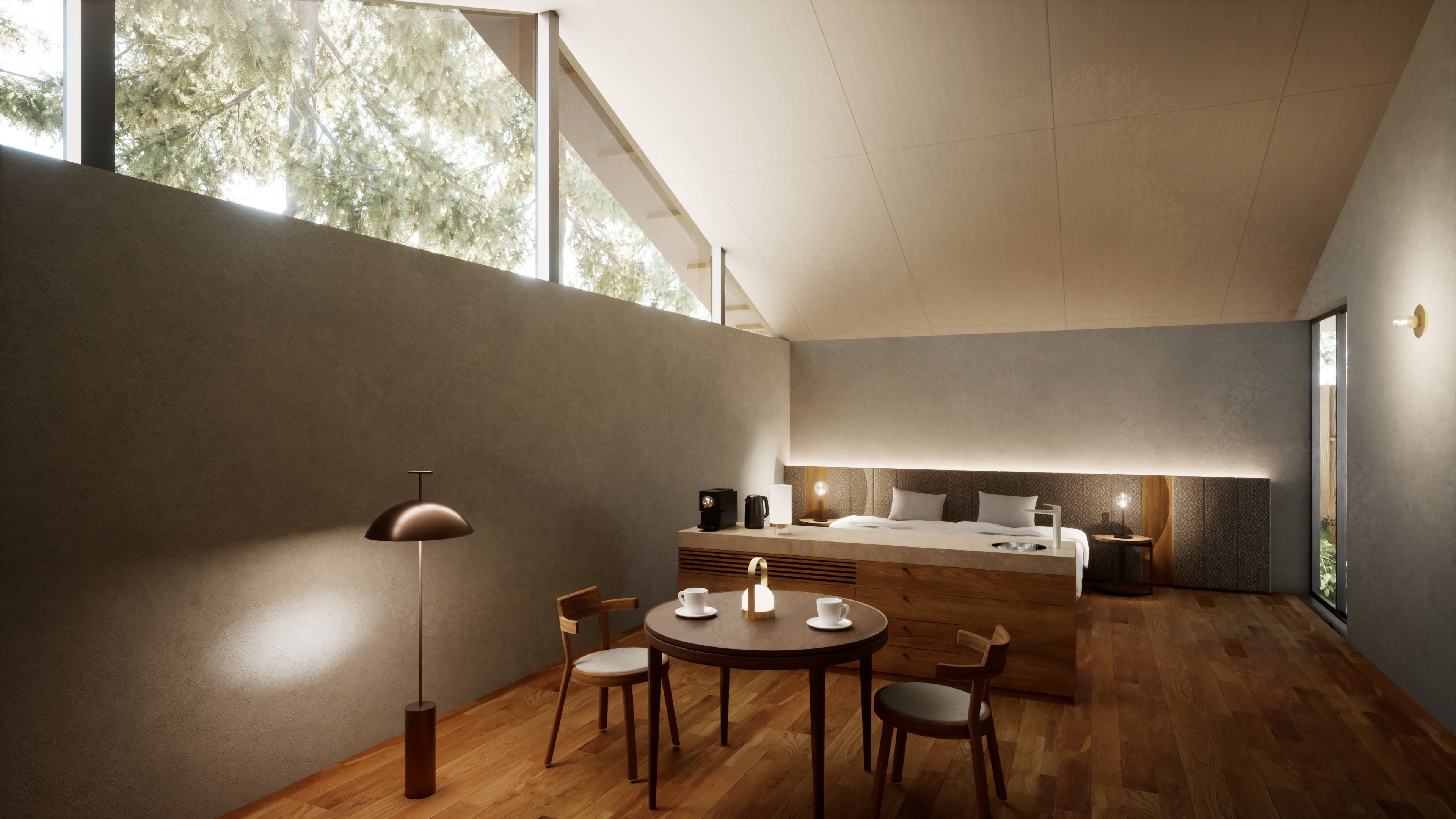 斜面地に立っており、エントランス、リビングスペース、ベッドスペース、浴室が段々状に連なっています。自然の起伏を客室内に取り込み、地面の傾斜が感じられる客室に。塀で囲まれた小さな庭は、リビングスペース、ベッドスペース、浴室から望むことができ、プライベートな空間をお楽しみいただけます。