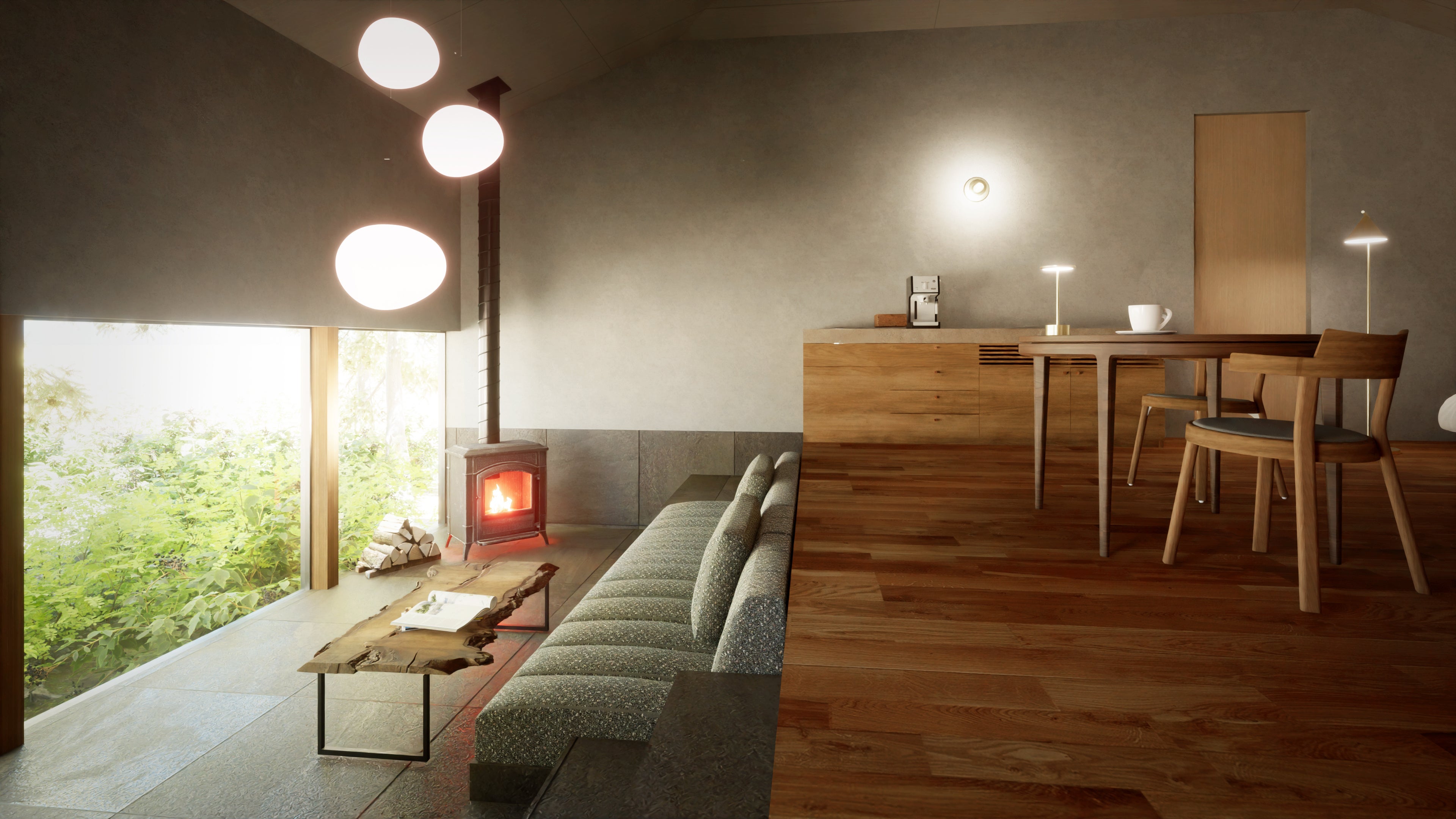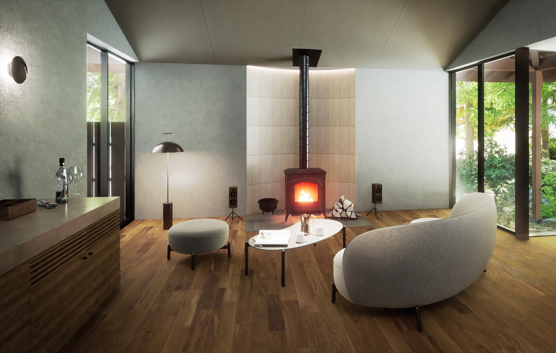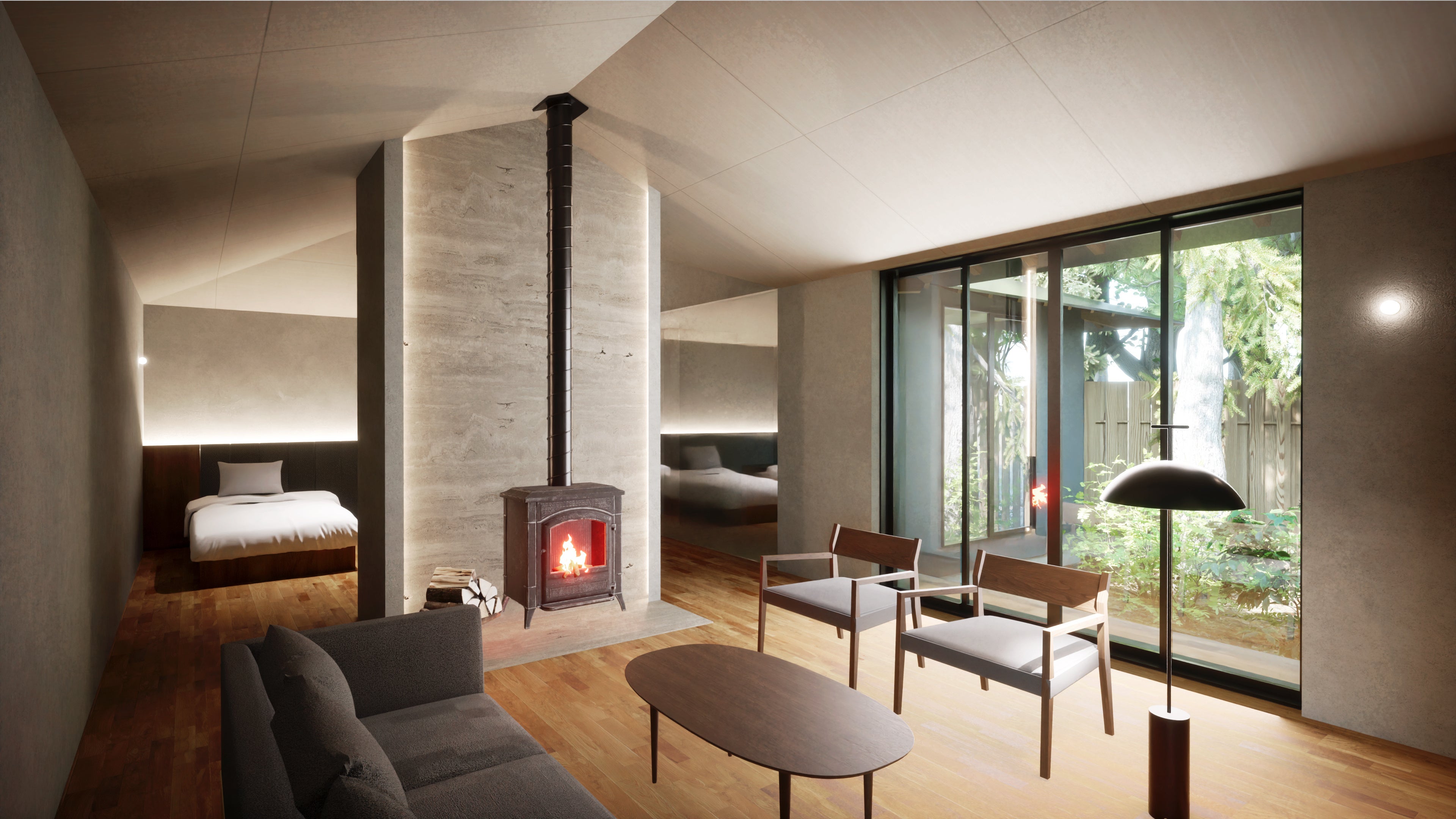 天井の高い客室の中央には暖炉が設置され、温かみのある空間になっています。寝室に設けられた高窓からは、木々のみどりを眺めるとともに、室内に明るい光を取り込み、自然の中で過ごすひとときをお楽しみいただけます。