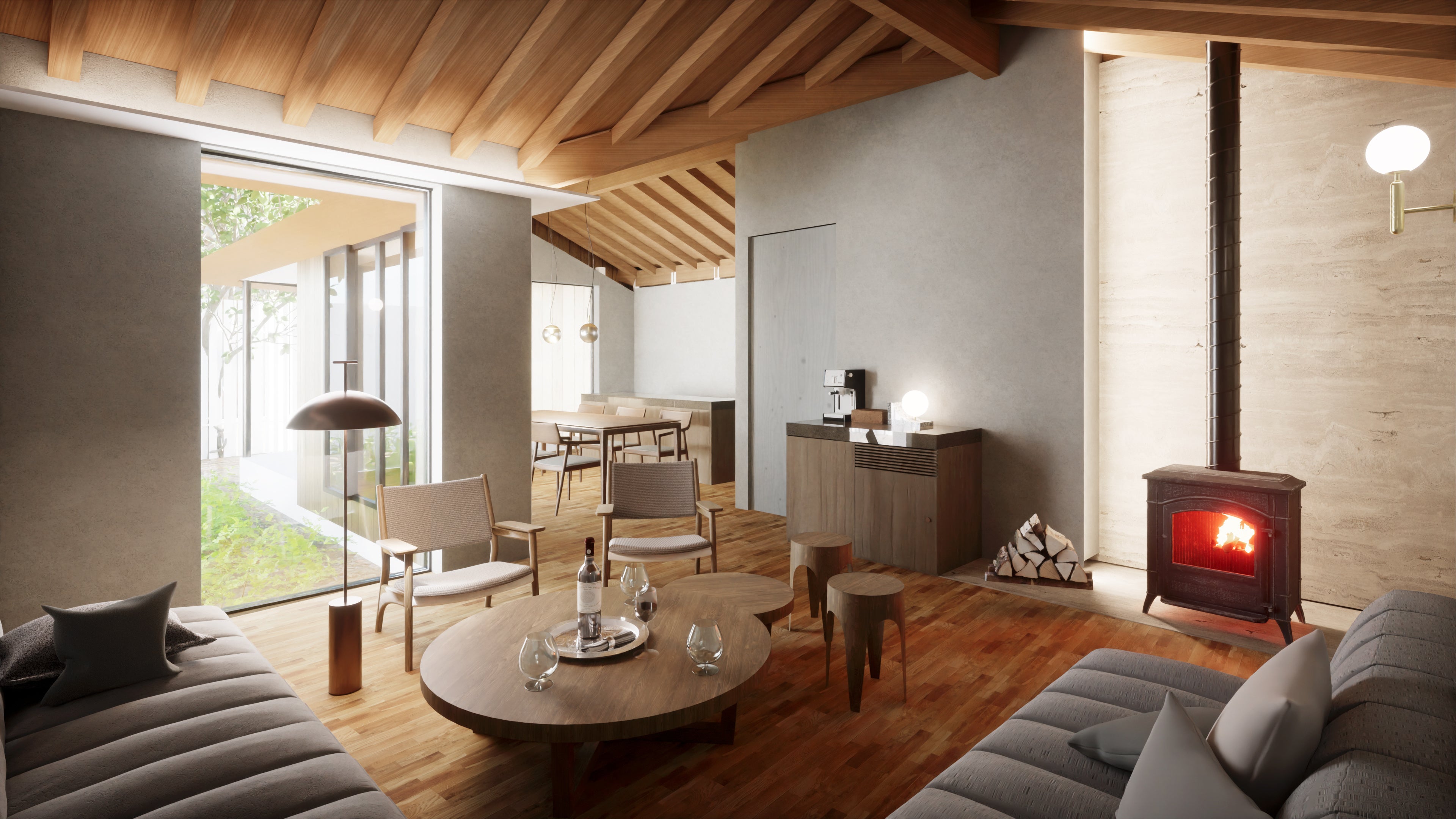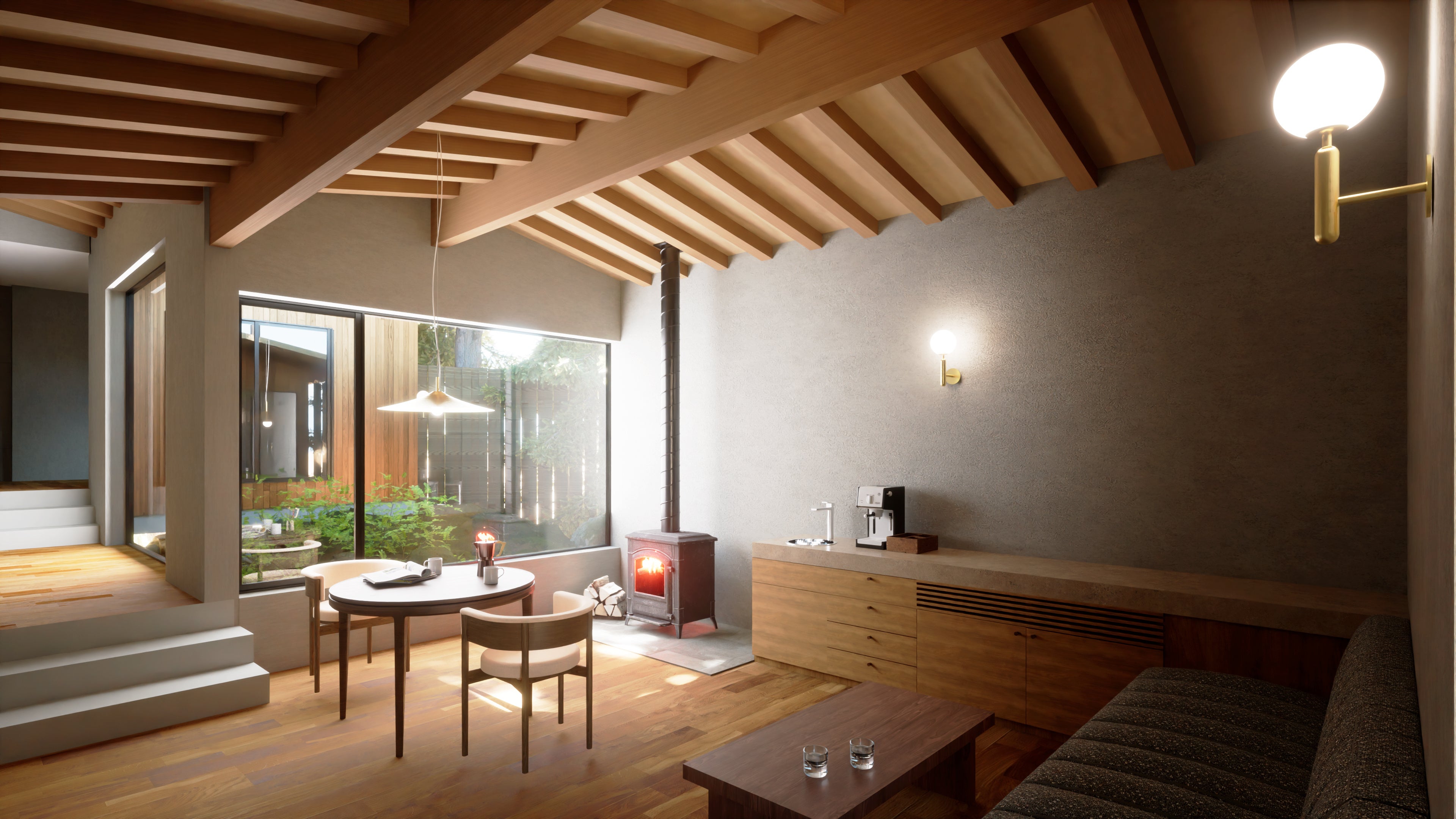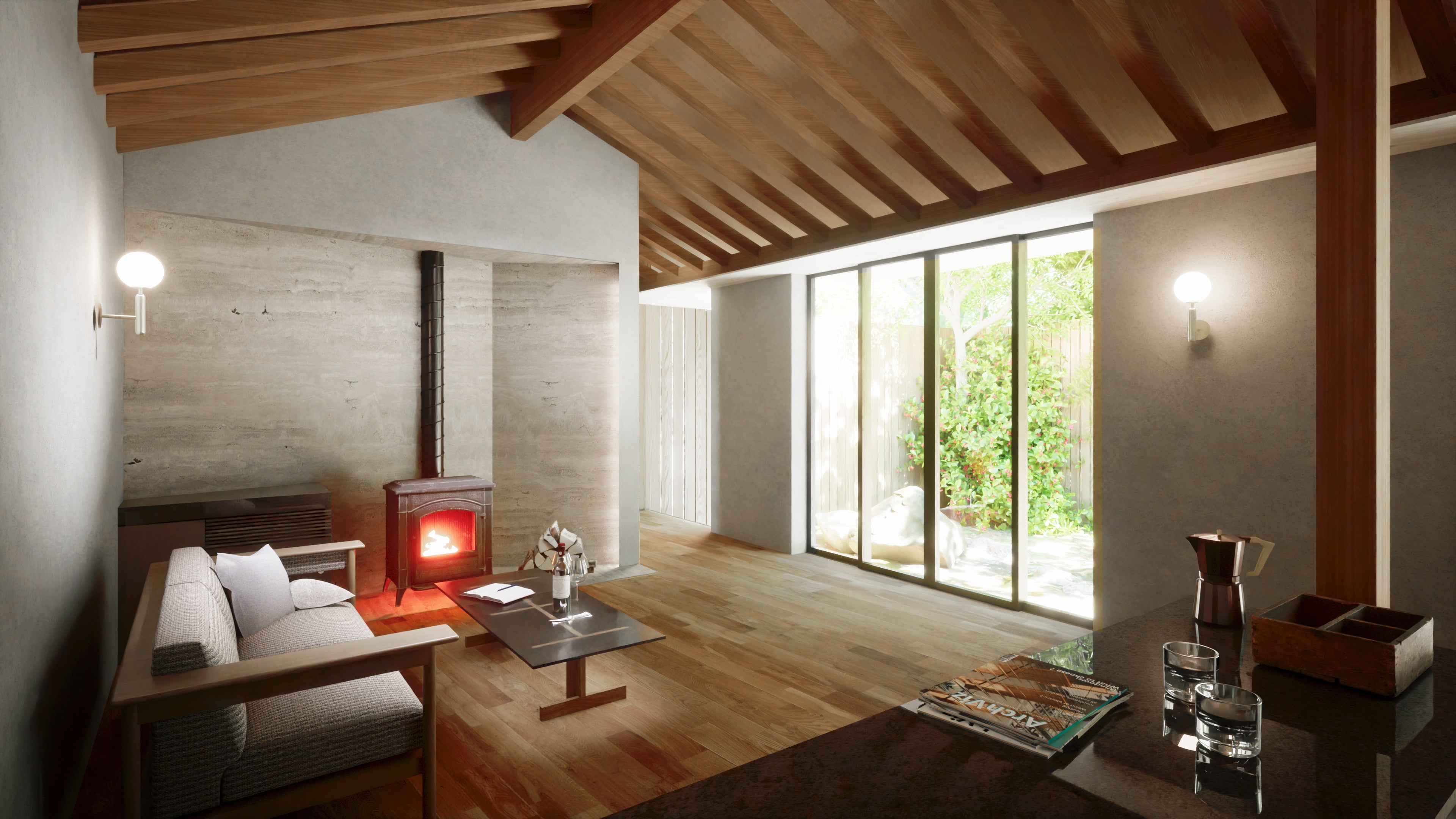 天井の高い客室の中央には暖炉が設置され、温かみのある空間になっています。寝室に設けられた高窓からは、木々のみどりを眺めるとともに、室内に明るい光を取り込み、自然の中で過ごすひとときをお楽しみいただけます。