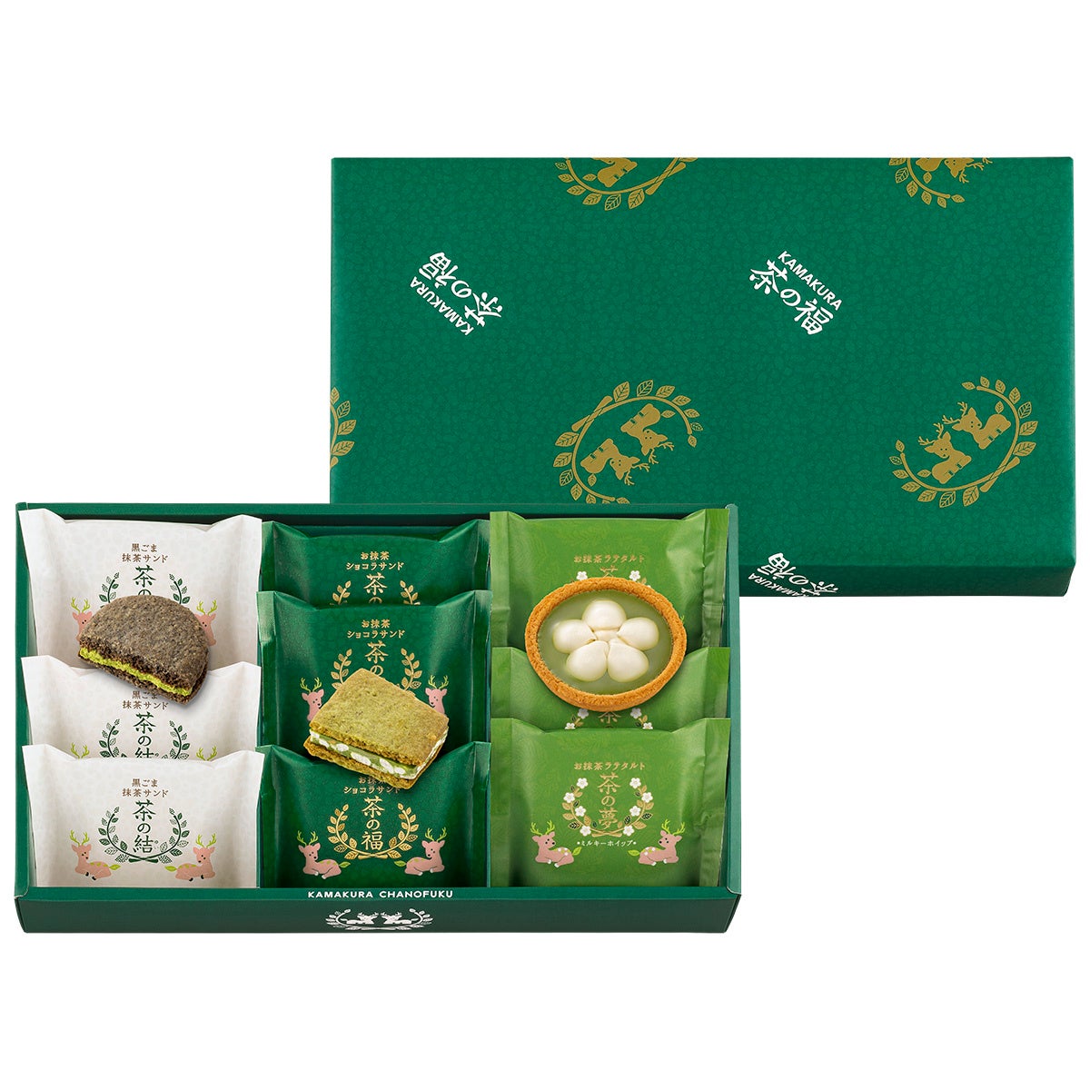 3種のお抹茶スイーツを存分にお楽しみ頂ける詰合せです。代表作『お抹茶ショコラサンド 茶の福』と季節限定『お抹茶ラテタルト 茶の夢』、抹茶とごまが結ばれた『黒ごま抹茶サンド 茶の結(ゆい)』。“福・夢・結”など縁起の良い名前の茶菓が詰まったお詰合せは大切な方への贈り物にぴったりです。