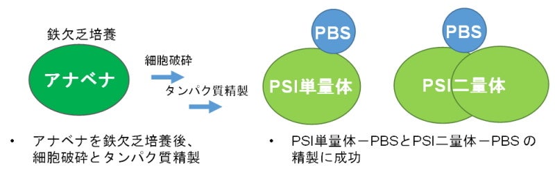 - 本研究は、鉄欠乏環境で培養されたシアノバクテリアから、光化学系I複合体(PSI)にPBSが結合した超複合体を精製することに成功しました。