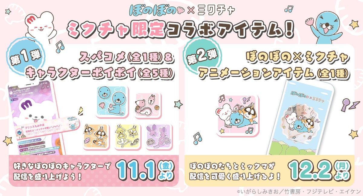 株式会社DONUTS(東京都渋谷区、代表取締役:西村啓成)が開発・運営するライブ配信&動画アプリ「ミクチャ」は、長年愛されている人気TVアニメ『ぼのぼの』とのコラボ企画を2024年10月15日(火)から2025年6月30日(月)にかけて実施しています。コラボ期間中は「ミクチャ」アプリ内で様々なイベントを開催するほか、ライブ配信時にリスナー(視聴者)が使用できる『ぼのぼの』の応援アイテムが期間限定で登場します。