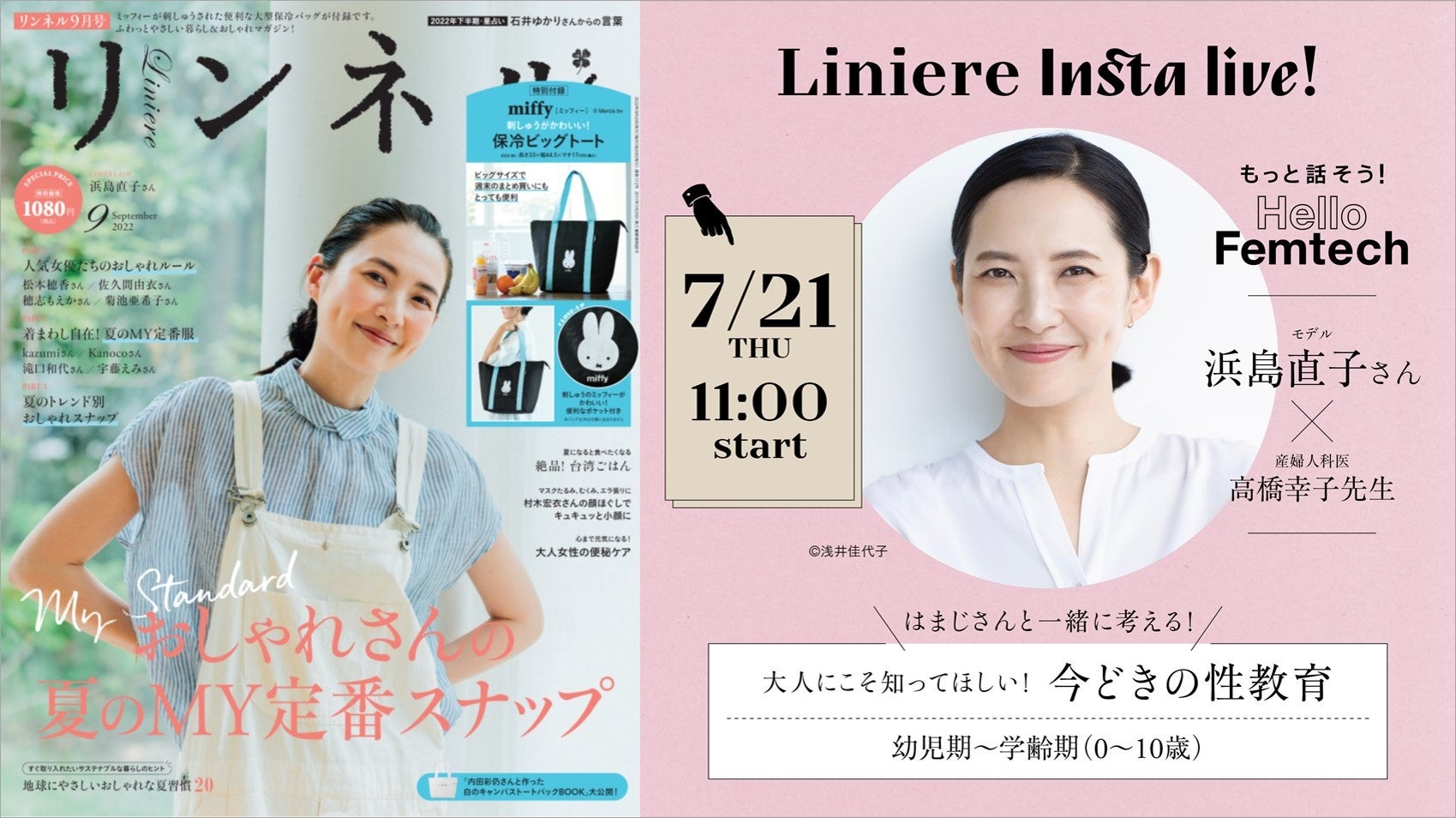 7月21日(木)11時から、モデルの浜島直子さんと産婦人科医の高橋幸子先生をお迎えして、No.1ファッション誌(※)『リンネル』のインスタライブを開催します。テーマは、8月号で特集している「大人にこそ知ってほしい! 今どきの性教育」です。