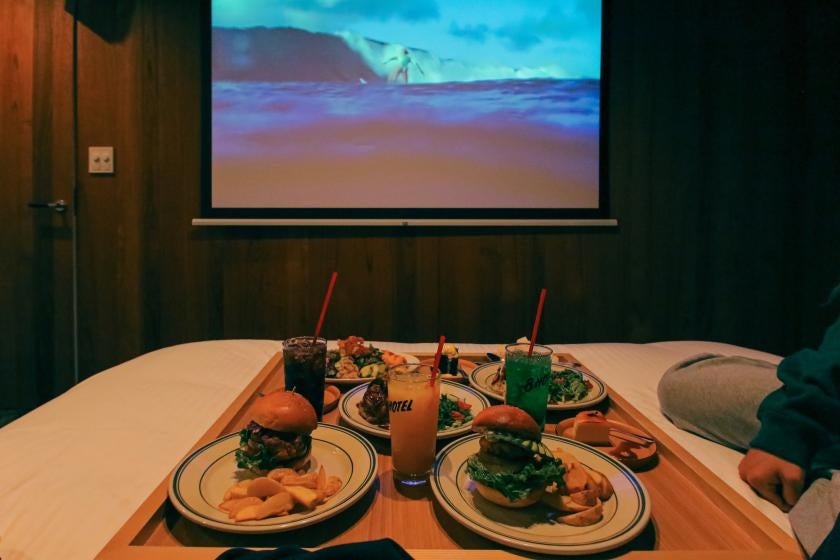 8HOTEL SHONAN FUJISAWAのシアタールームは、85インチの大画面シアター・4台のスピーカーを設置しており、迫力ある臨場感の中、お客様ご自身のアカウントで映画やドラマをお楽しみいただけます。さらに完全防音のプライベート空間なので、リラックスしながら自分だけの世界へどっぷりと浸ることができます。もちろんホテル1階の8loungeにルームサービスのオーダーも、ご自身で飲食物のお持ち込みもOK!