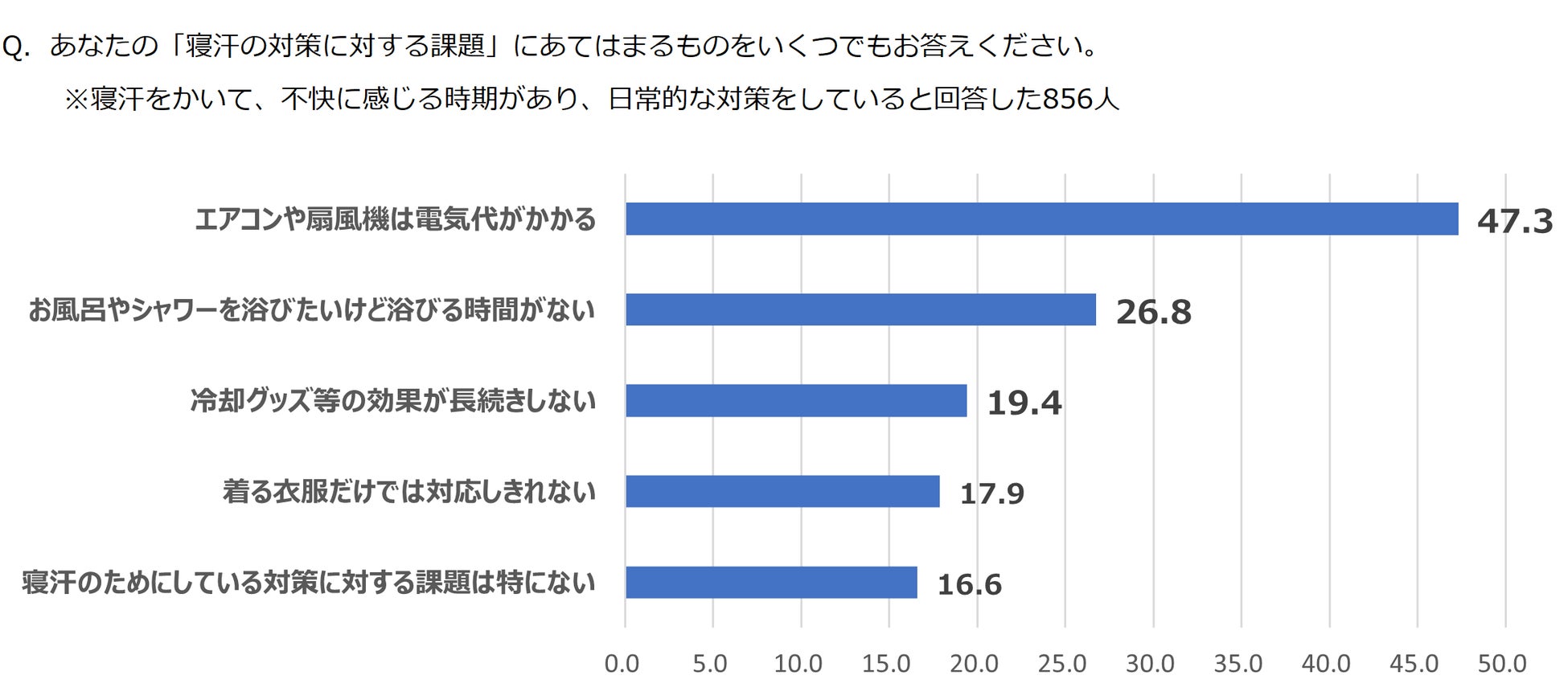 「寝汗の対策に対する課題」は、「エアコンや扇風機の電気代」47.3%がトップ。他に、「お風呂やシャワーを浴びる時間がない」など。