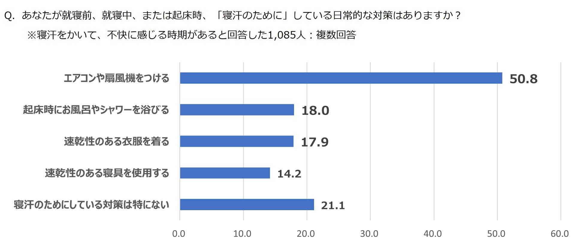 就寝前、就寝中、起床時に「寝汗のために」している日常的な対策は、「エアコンや扇風機をつける」が50.8%で断トツ。続いて、「起床時にお風呂やシャワーを浴びる」、「速乾性のある衣服を着る」、「速乾性のある寝具を使用する」など。いろいろな工夫をしている人がいる一方で、対策をとっていない人が21.1%
