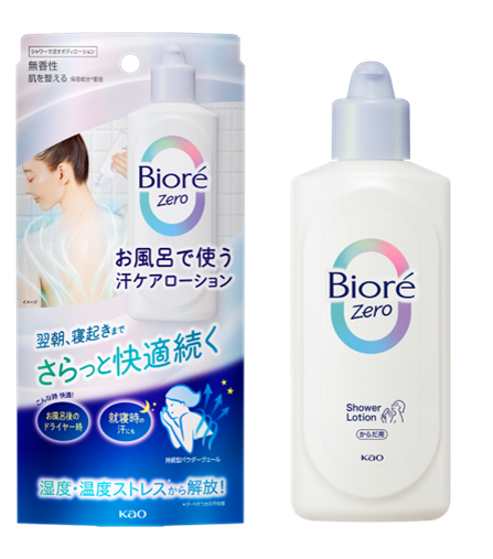 『ビオレZero お風呂で使う汗ケアローション』は、洗浄後の肌に塗布した後、シャワーで流すタイプのボディローションです。独自のシャワー型キャップで、手の届きにくい背中にも簡単に使えます。汗を乾かし続ける「高蒸散パウダー」がヴェールのように肌を包み込み、さらさら感が長時間持続。入浴後から翌朝の寝起きまでさらっと快適が続き、気持ちよい一日をスタートできます。