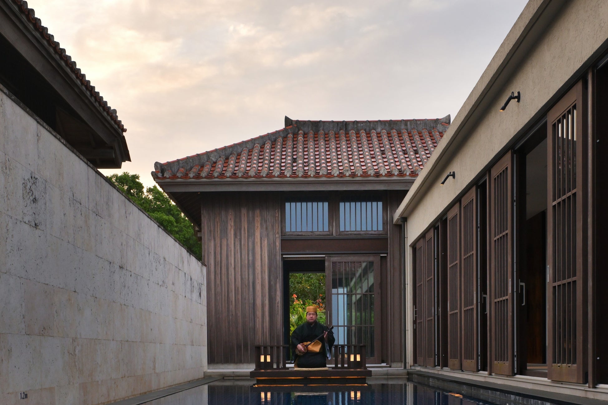 含まれるもの:客室での琉球古典音楽の演奏1回、食事(朝食2回・夕食2回)、「朝の調律深呼吸」「夜の鍛錬深呼吸」、「吉祥紋庭めぐり」すべてプライベート開催、「福を届ける紅型絵手書き」体験
