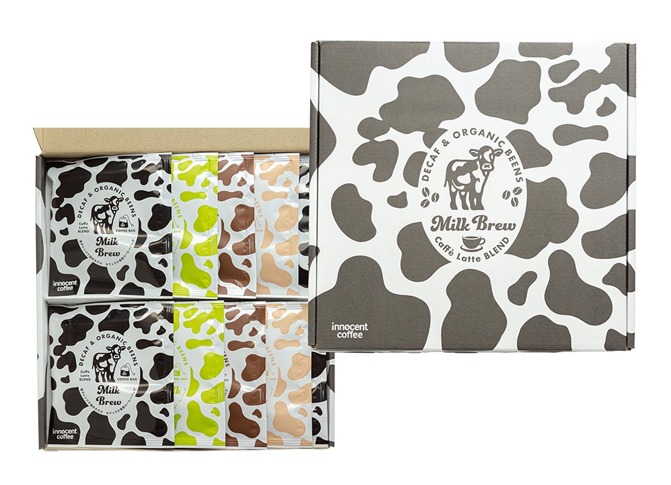 デカフェ専門ブランドのinnocent coffeeから、マグカップにコーヒーと牛乳を入れて、電子レンジで温めるだけでカフェラテができるコーヒーバッグ。ミルクブリュー(4個)、ソイミルクブリュー(2個)、アーモンドミルクブリュー(2個)、オーツミルクブリュー(2個)のセット。