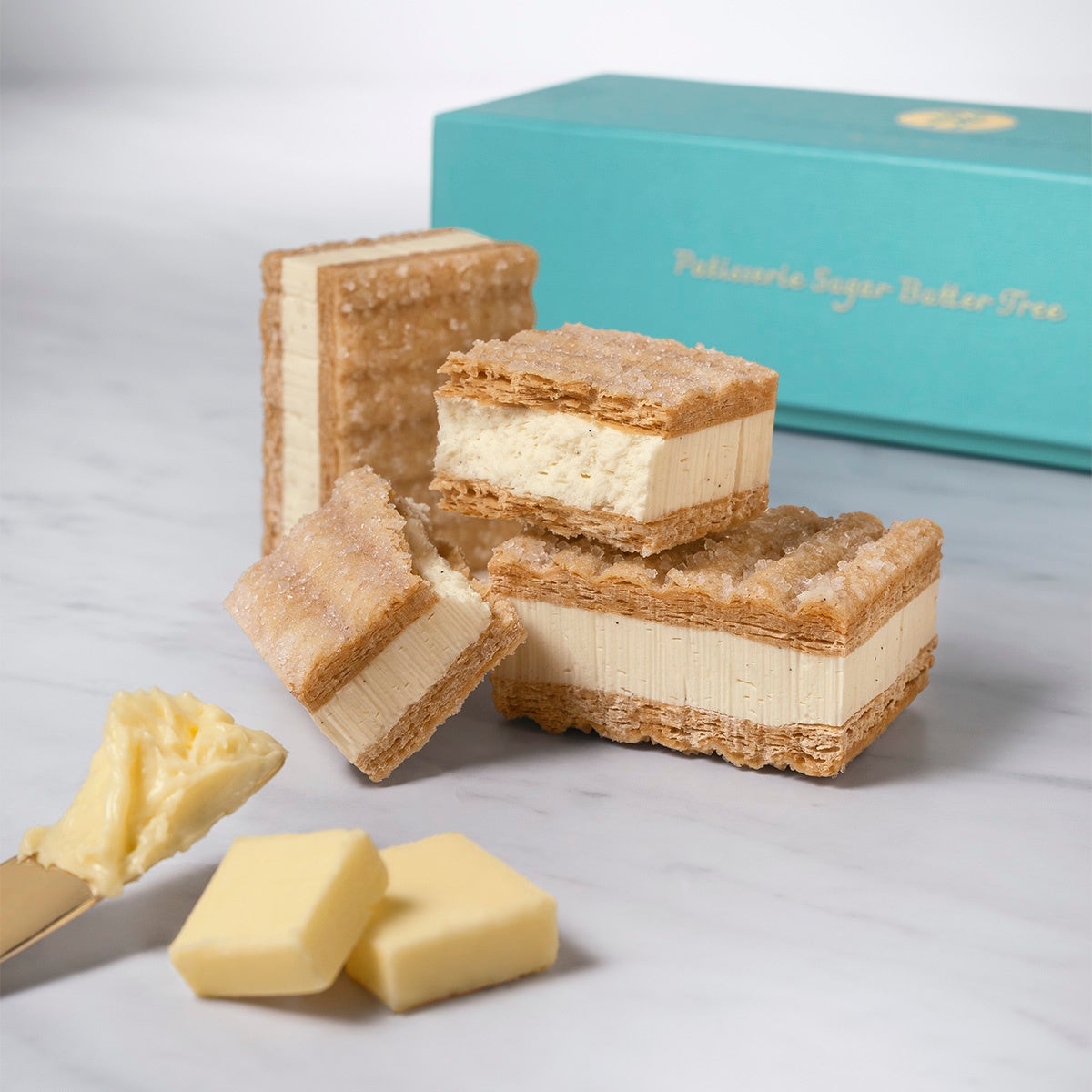 「シュガーバターの木」特製のミルキーホワイトショコラに、発酵バターと北海道生乳100%生クリームをとろとろ混ぜ合わせ、とろける美味しさの芳醇バタークリームができあがりました。穀物の香ばしさを活かしたシュガーバター生地にたっぷりはさんで召し上がれ!定番の『シュガーバターサンドの木』とはひとあじ異なる、パイのようなザクザク食感にも注目です。